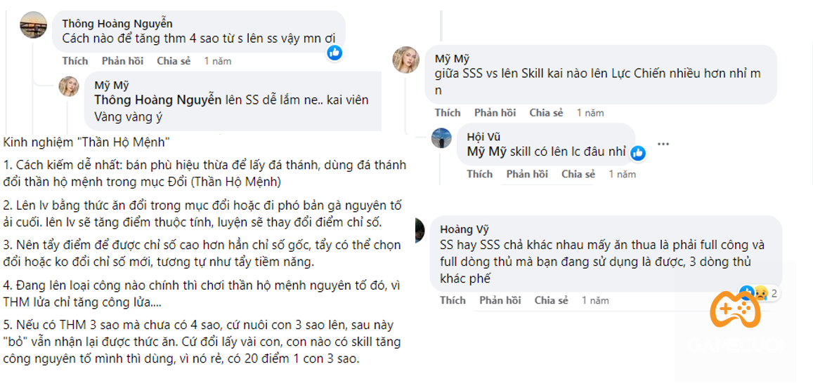 \ác Thần Hộ Mệnh có thể học các loại kỹ năng cơ bản dù khác nguyên tố (ví dụ Thần Hộ Mệnh Lửa có thể học skill Nước Cắt vốn dùng cho Thần Nước, Bão Lốc vốn dùng cho Thần Gió,…) tuy nhiên không thể học các kỹ năng đặc trưng chỉ dành riêng cho từng loại Thần Hộ Mệnh (ví dụ Thần Hộ Mệnh Lửa có thể học skill Bùng Cháy và Thuần Khiết nhưng không thể học Phản Chiếu của Thần Nước hay Hóa Đá của Thần Đất và ngược lại). Thần Hộ Mệnh với số sao khác nhau, số kỹ năng được học khác nhau (3 sao 5 skill, 4 sao 7 skill, 5 sao 8 skill), dùng sách sẽ có xác suất thay thế skill hoặc tăng thêm nếu số skill hiện tại nhỏ hơn 4, muốn lên 5 6 7 8 thì bắt buộc phải dung hợp, dung hợp với những con đã có nhiều kĩ năng thì có thể tăng số lượng skill, thay thế, thậm chí là không thay đổi. Các kỹ năng thì cũng có 3 phẩm chất là sơ, trung và cao, các kỹ năng thường (khác phẩm chất) thì có cộng dồn những kỹ năng đặc biệt của thần riêng thì không cộng dồn mà chỉ tính mỗi hiệu quả cao nhất.