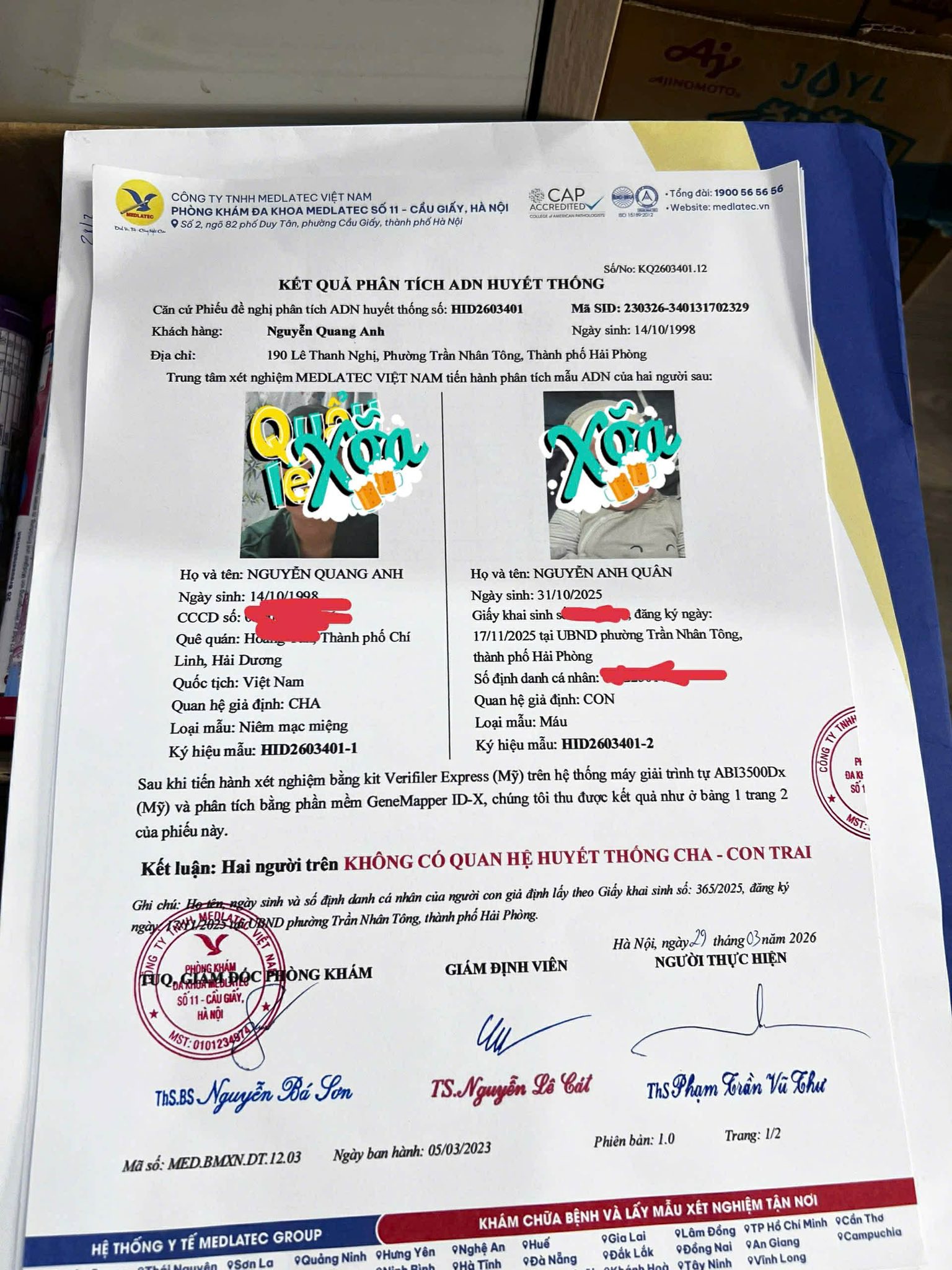 Mọi chuyện bắt đầu từ những nghi ngờ về ngoại hình của bé Gấu – cậu con trai mà Quang Anh hết lòng yêu thương – hoàn toàn không có nét giống bố. Theo ghi nhận của chúng tôi từ các bình luận, chính chủ đã quyết định đi xét nghiệm ADN (thậm chí là làm tới 3 lần cho chắc chắn) để rồi nhận về một sự thật đắng chát: Đứa con bấy lâu nay anh chăm sóc không phải là giọt máu của mình.