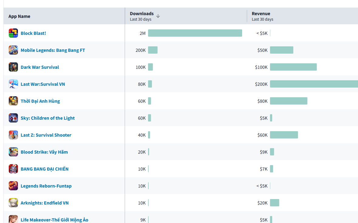 Nhìn vào bảng thống kê của Công ty cổ phần phát triển công nghệ số Hồng Hà trong 30 ngày gần đây, chúng ta có thể thấy một sự đối lập đầy thú vị mang tính đặc trưng của dòng game giải trí nhẹ nhàng. Block Blast đang chứng tỏ sức hút khủng khiếp tại thị trường Việt Nam khi mang về tới 2 triệu lượt tải xuống, bỏ xa hoàn toàn các tựa game bom tấn khác trong danh sách như Mobile Legends hay Last War. Thế nhưng, doanh thu in-app được ghi nhận lại nằm ở mức rất khiêm tốn, chưa tới 5 nghìn đô la Mỹ. Sự chênh lệch này thực chất rất dễ hiểu và phản ánh đúng bản chất của dòng game giải đố hyper-casual.