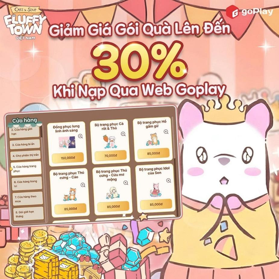Nhằm tri ân sự ủng hộ của cộng đồng, NPH goPlay triển khai ưu đãi giảm giá các Gói quà ingame lên đến 30% khi nạp thông qua webshop goPlay. Đây được xem là cơ hội để người chơi có thể sở hữu thêm Đá Quý, Trang phục và vật phẩm trang trí, giúp tối ưu tốc độ xây dựng thị trấn theo phong cách riêng.