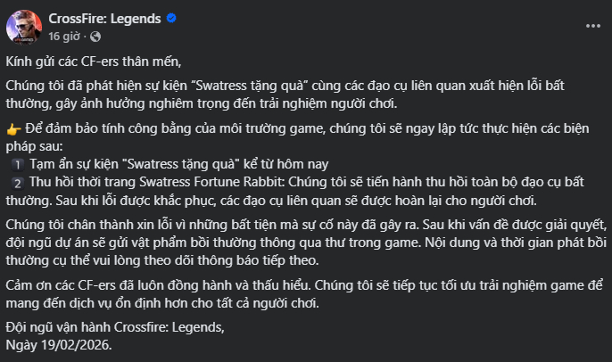 Trước sự cố ngoài ý muốn này, phía đội ngũ vận hành Crossfire Legends đã nhanh chóng có động thái tiếp nhận thông tin. Trong thông báo mới nhất, nhà phát hành thừa nhận sự cố liên quan đến việc hiển thị của nhân vật Swatress và gửi lời xin lỗi chân thành đến cộng đồng CF-ers.