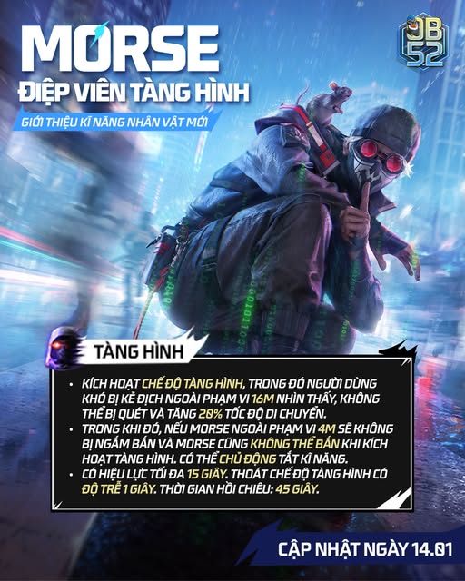 Cộng đồng game thủ Free Fire đang sục sôi trước thông tin về nhân vật mới nhất sắp cập nhật vào Đảo Quân Sự: Morse. Với bộ kỹ năng mang tính đột phá về khả năng ẩn nấp và di chuyển, Morse hứa hẹn sẽ làm thay đổi hoàn toàn cục diện các trận đấu xếp hạng trong thời gian tới.