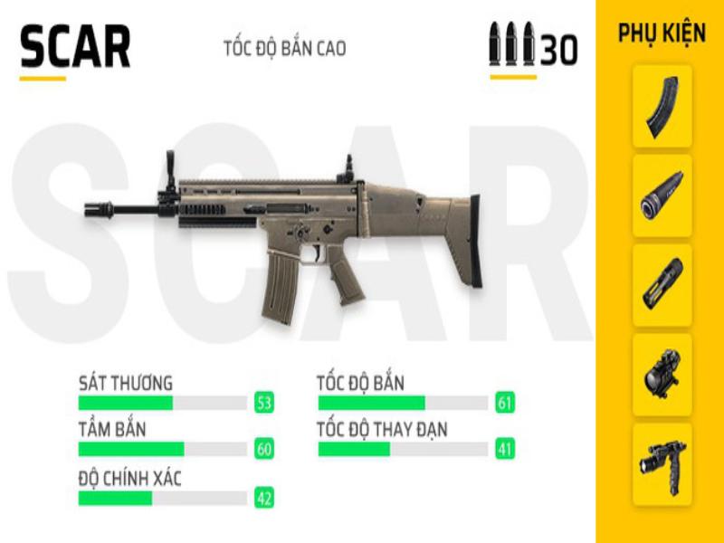 Dẫn đầu danh sách không ai khác chính là SCAR, một biểu tượng của sự ổn định và là lựa chọn được tin dùng bậc nhất. Điểm sáng giá nhất của vũ khí này nằm ở chỉ số xuyên giáp cơ bản cực tốt cùng khả năng thăng tiến sức mạnh đáng nể thông qua việc nâng cấp bằng chip. Khi anh em chịu khó đầu tư gắn đủ ba chip nâng cấp, SCAR sẽ lột xác hoàn toàn với sự cải thiện vượt bậc về các chỉ số cốt lõi như sát thương, tốc độ bắn và độ chính xác. Chính điều này biến SCAR trở thành một cỗ máy hủy diệt ở giai đoạn cuối trận, nơi mà khả năng đục thủng giáp ba và giáp chống nổ của kẻ địch trong chớp mắt là yếu tố sống còn quyết định thắng bại.