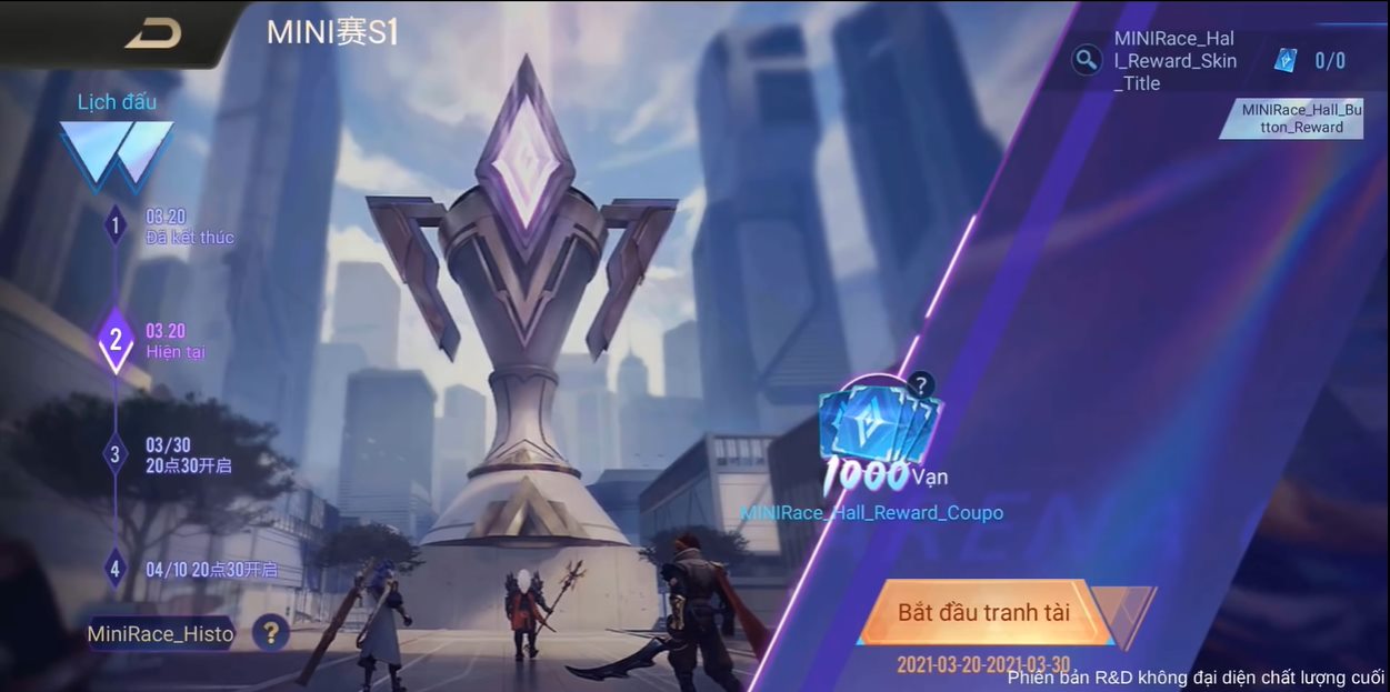 Mini Tournament – chế độ mới xuất hiện trong máy chủ thử nghiệm tuy nhiên đang gây ra cơn sốt cực lớn với cộng đồng game thủ Liên Quân Mobile. Phần thưởng được đồn đoán của chế độ này lên tới 10 triệu quân huy – quân huy khóa khiến người chơi không khỏi phấn khích. Có thể nói với số lượng quân huy khồng lồ này, người chơi có thể thỏa sức mua các vật phẩm trong gảm từ tướng, trang phục, ngọc, v..v..