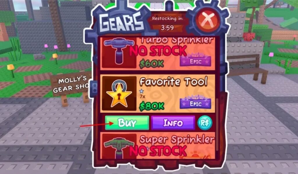 Một điểm quan trọng là Gear Shop thường xuyên thay đổi danh mục theo thời gian, cập nhật sau mỗi đợt nghỉ của shop, điều này tạo ra yếu tố chiến lược khi bạn săn tìm gear hiếm. Vì vậy, việc kiểm soát thời gian và quan sát lịch nghỉ của shop giúp bạn “nhắm trúng” dụng cụ quý hiếm như Super Sprinkler dễ dàng hơn.