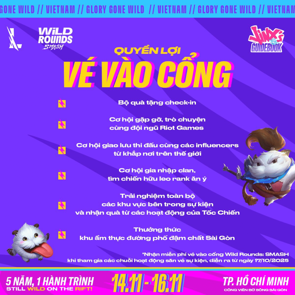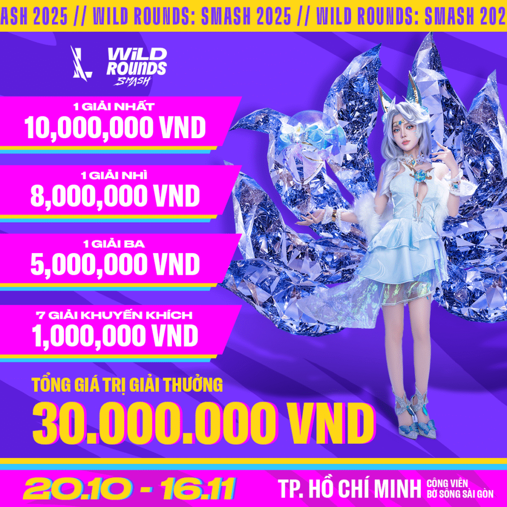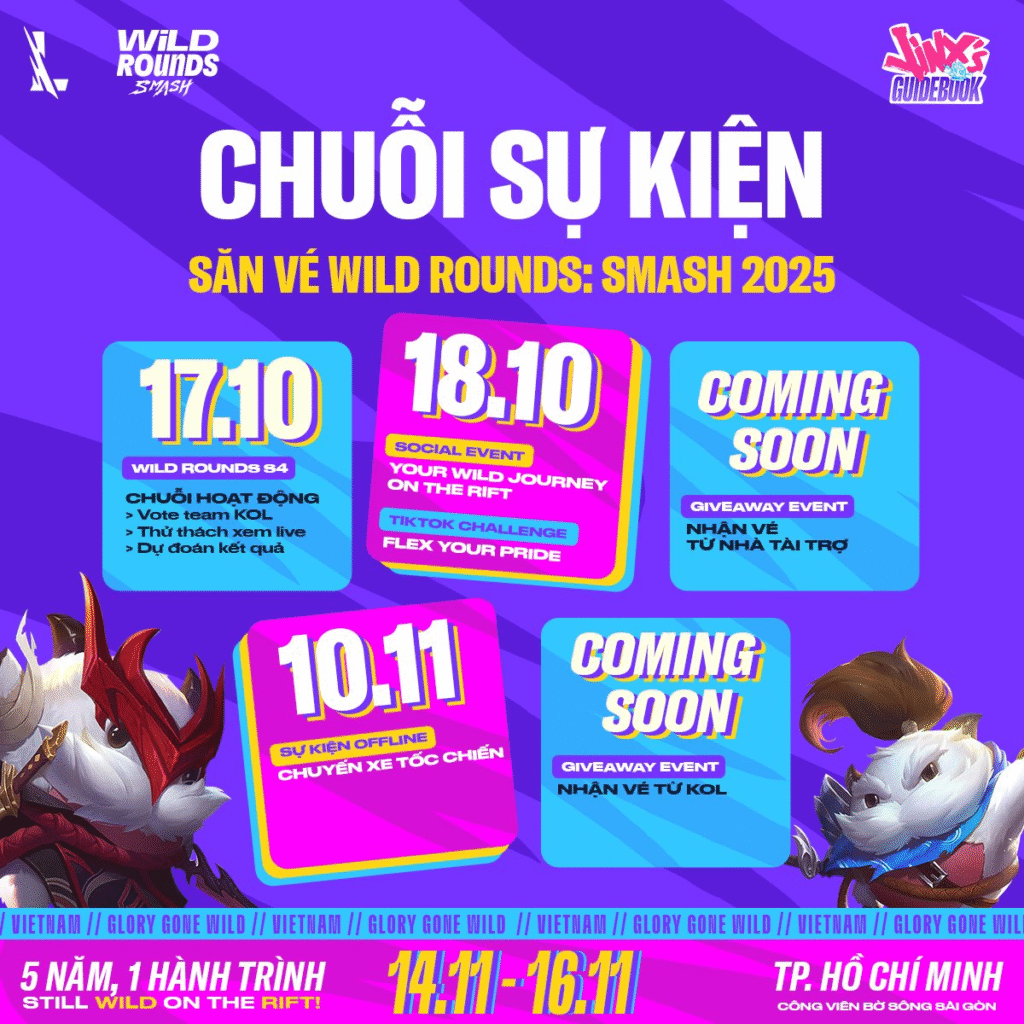 Với tinh thần vui vẻ, tăng tính kết nối và tri ân người chơi LMHT: Tốc Chiến toàn cầu, sự kiện Wild Rounds: SMASH 2025 tổ chức tại Công viên Bờ sông Sài Gòn (TP.HCM) hứa hẹn sẽ mang đến hàng loạt trận đấu hấp dẫn cùng nhiều nội dung giải trí đa dạng. Đồng thời cùng với thông điệp chủ đề “Still Wild on the Rift”, Wild Rounds: SMASH 2025 đánh dấu cột mốc 5 năm phát triển bền vững của Liên Minh Huyền Thoại: Tốc Chiến, khẳng định rõ việc cộng đồng người chơi của tựa game này vẫn đang không ngừng lớn mạnh, gắn kết và tiếp tục lan tỏa niềm đam mê khắp toàn cầu.