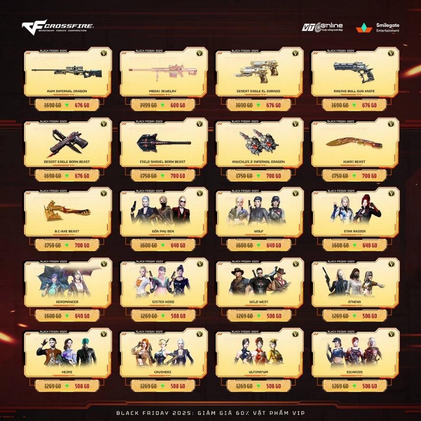 Truyền thống giảm giá sâu mỗi dịp Black Friday đã được Crossfire duy trì suốt nhiều năm nay như một ngày hội thường niên quen thuộc đối với game thủ. Mùa lễ hội mua sắm của năm nay tiếp tục được NPH VTC Online duy trì với mức giá giảm đến 60% trên mọi mặt trận.