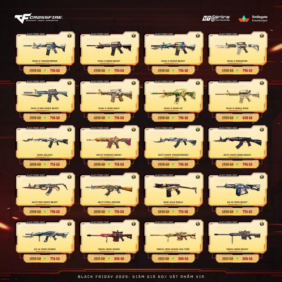 Trong ngày hội Black Friday năm nay, các vũ khí hàng đầu như G36C Cyber Mirage, M14EBR Tortoise, Scar Light-S Bạch Hổ, QBZ-03 Jewelry hay M4A1-S Transformer,… đều giảm giá 60%. Những món vũ khí này không chỉ mạnh mẽ mà còn là lựa chọn thiết yếu, giúp phát huy tối đa hiệu quả trong mọi chế độ chơi.