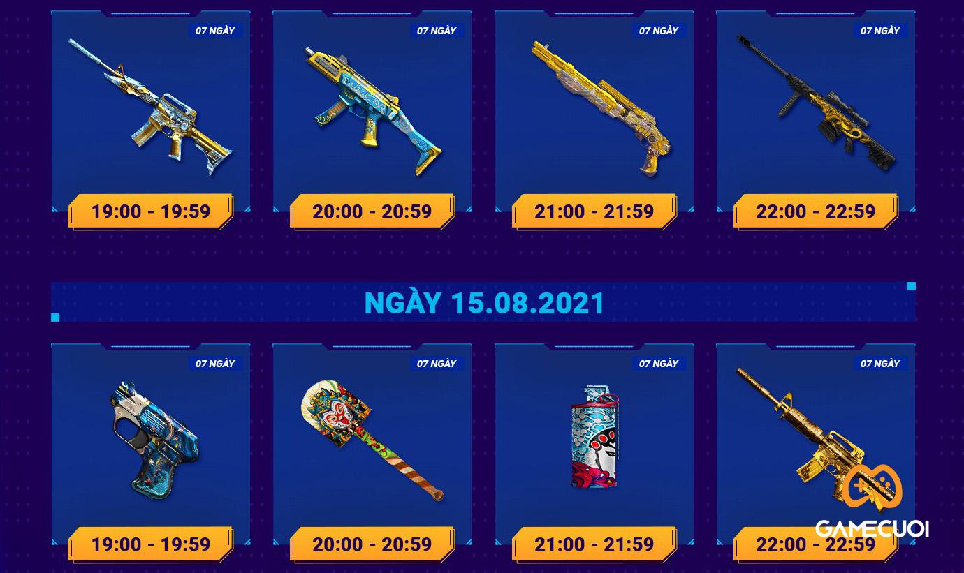 Cùng trở lại trong sự kiện lần này là Đăng nhập giờ vàng, game thủ Đột Kích chỉ cần chơi game trong khung giờ chỉ định trong 2 ngày 14 và 15/8 là sẽ nhận được nhiều quà tặng hấp dẫn. Tất cả các phần thưởng này đều là báu vật mới xuất hiện trong các bản cập nhật gần đây, vì thế nếu muốn trải nghiệm món nào, bạn hãy nhanh tay đăng nhập vào thời điểm đó nhé.