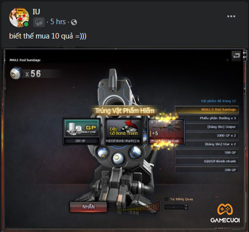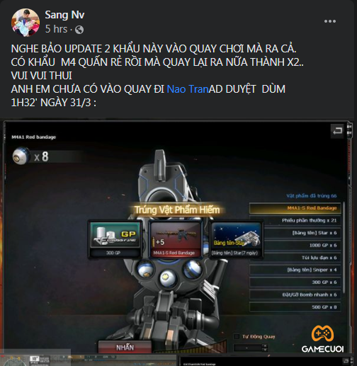 Ngay trước khi tháng 3 kết thúc, Đột Kích đã kịp khởi động thêm một sự kiện, mở bán QCMM GP event với 2 báu vật M4A1-S Red Bandage và KAC Chainsaw-Red Taping. Từng nằm trong QCMM GoCoin, nhiều game thủ vì điều kiện kinh tế có hạn đã không thể sở hữu 2 khẩu súng này, nhưng với QCMM GP thì tất cả người chơi đều có cơ hội – rất nhiều bài viết chia sẻ “trúng hàng nóng” đã xuất hiện trên group CĐĐK sáng nay, nhiều game thủ đã thoải mái “đốt” kho GP của mình để rinh về 2 báu vật hiếm này.
