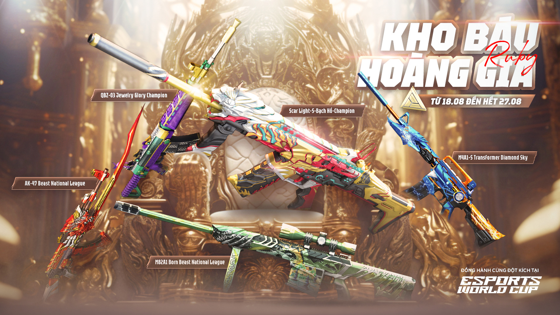 Đây là Kho Báu Hoàng Gia Ruby chính thức chào mừng giải đấu EWC 2025 của Đột Kích. Bên trong danh sách phần thưởng là bộ vũ khí gồm những món siêu ngầu có liên quan đến chủ đề thi đấu eSports.