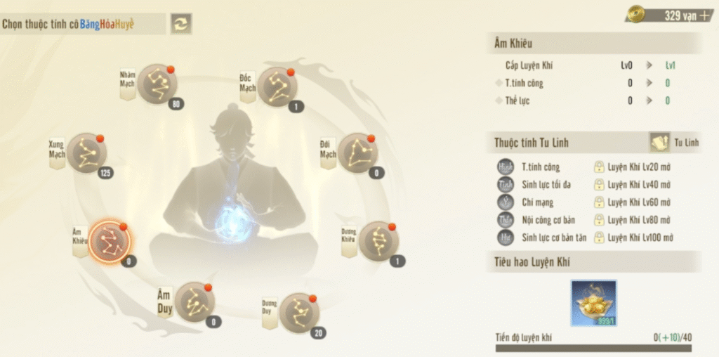 Ở khía cạnh phát triển nhân vật, phiên bản mới mang đến nhiều cơ chế nâng cấp đáng chú ý. Tính năng Kinh Mạch – Luyện Khí giúp người chơi tăng trưởng sức mạnh thông qua việc tu luyện. Hệ thống luyện khí gồm 8 kinh mạch, mỗi kinh mạch sở hữu các thuộc tính cơ bản và thuộc tính Tu Linh. Khi đạt đến các mốc nhất định, người chơi có thể tiếp tục nâng cấp để tối ưu hóa sức mạnh tổng thể, từ đó gia tăng đáng kể lực chiến.