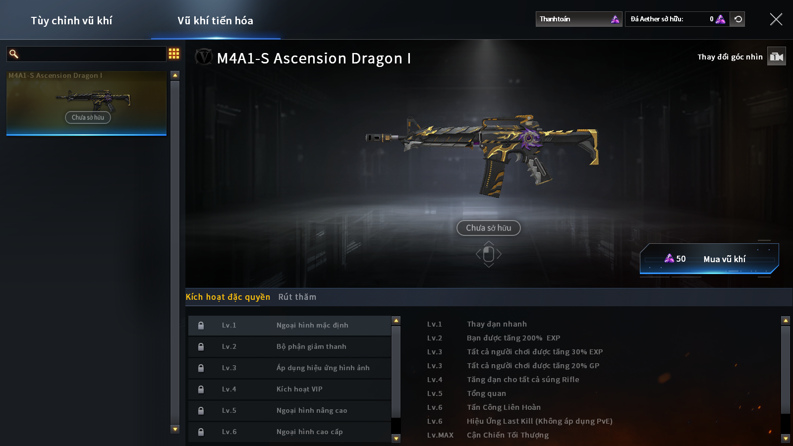 Khác với các dòng VIP cũ, M4A1-S Ascension Dragon không có mức giá “khủng” ban đầu mà người chơi sẽ tự quyết định “đầu tư” bằng cách mua đá tím để nâng cấp từng level. Ví dụ khi ở level 1, súng chưa có giảm thanh hay quyền lợi VIP nhưng vẫn có chỉ số nâng cấp và tấn công cận chiến và game thủ chỉ tốn 100 ngàn để sở hữu. Càng nâng lên level cao, súng sẽ càng nhiều quyền lợi cũng như thay đổi ngoại hình hầm hố, ấn tượng hơn, và khi đạt level 7, người chơi còn có thể rút thăm trong shop đặc quyền để mở khoá thêm skin, sound và búp bê đặc biệt nữa.