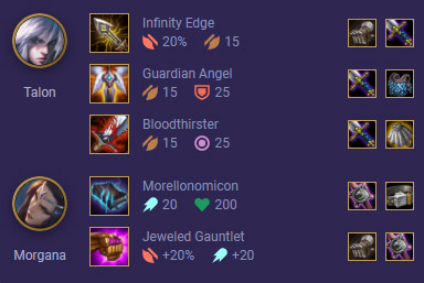 - Talon và Morgana đều là những carry tuyệt vời nếu có đồ ngon. Bạn hãy ném các trang bị sát thương phép lên Morgana và các trang bị gây sát thương vật lý lên Talon.