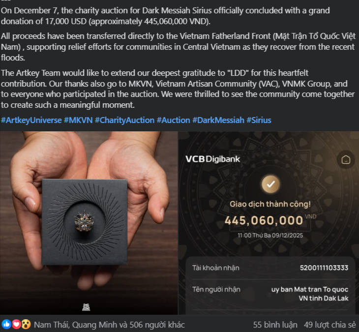 Theo thông báo từ ArtKey, một thương hiệu thủ công mỹ nghệ với các sản phẩm chính là keycap cho bàn phím cơ thì tại phiên đấu giá Dark Messiah Sirius vào 7/12/2025 vừa rồi, chiếc keycap Sirius đã thuộc về “LDD” (người mua ẩn danh) với mức giá $17,000 (Tương đương 445,060,000VND). Toàn bộ số tiền đấu giá đã được chuyển trực tiếp đến MTTQ Việt Nam – Tỉnh Đắk Lắk để khắc phục hậu quả do cơn bão số 13 gây ra tại miền Trung.